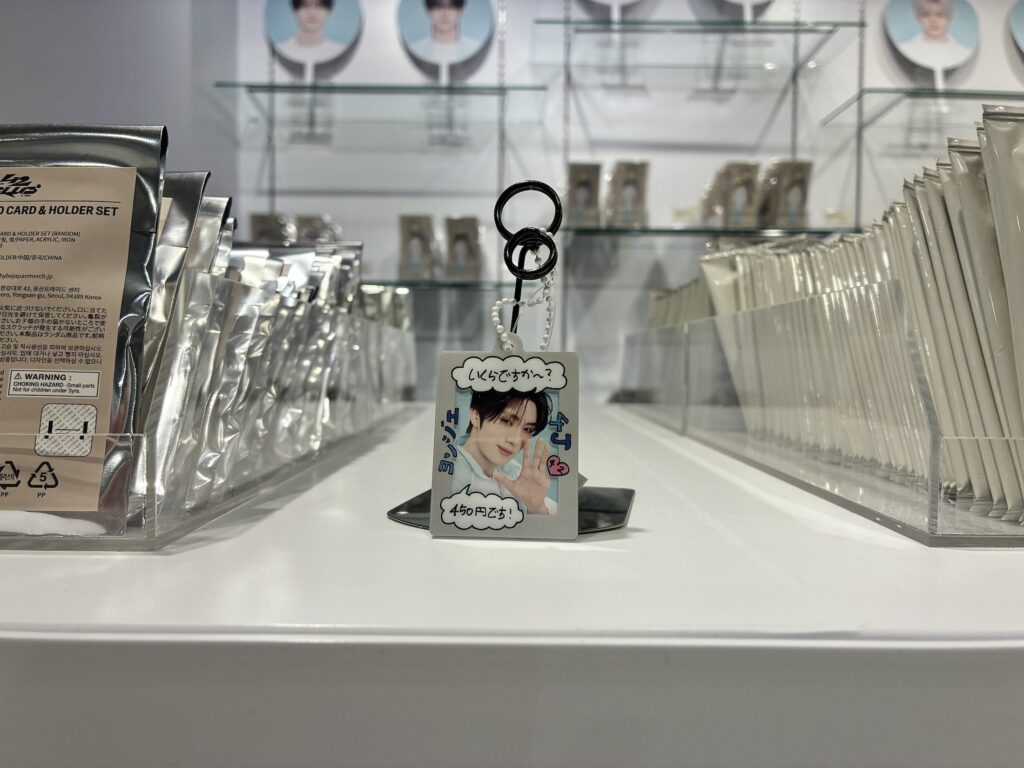 今回のファンミーティングの開催にあわせて制作された大人気のPHOTO CARDやIMAGE PICKET、ACRILIC KEYRINGなどが並んでいます。