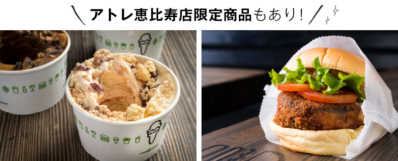 左・毎日お店で作られるフレッシュなアイスクリームはアトレ恵比寿店限定のフレーバーが登場。『エビーンス』『チョコレートピーナッツバタークランチクリート』『ザ・サードマンズミックス』の3種で、各¥480。