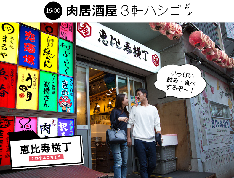 お休みの最後は、夕方から早めに恵比寿横丁へ。低価格で一度に色々な店舗を楽しめるので、テーマを決めてハシゴ飲みするのがおすすめです。