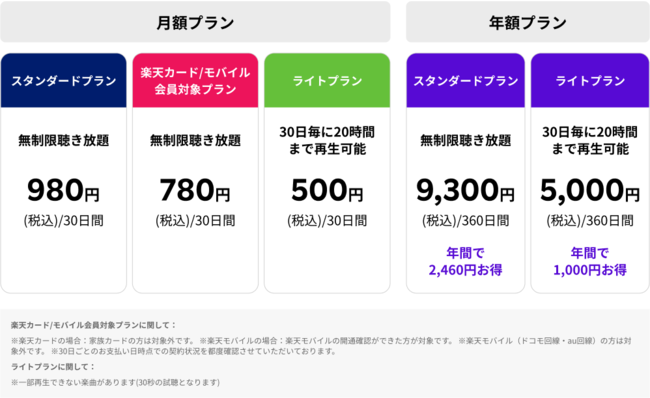 楽天グループ株式会社が運営する定額制の音楽聴き放題サービスです。iOSおよびAndroid™アプリで展開しており、約9,500万曲の楽曲を提供しています(2022年7月時点)。料金プランは、再生時間無制限の「月額 スタンダードプラン」(ウェブサイトからの申し込みで30日あたり980円(税込)、iOSアプリ内購入で月額1,080円(税込))、「月額 スタンダードプラン」と同様の約9,500万曲を無制限でお得に利用できる「楽天カード/モバイル会員対象プラン」(ウェブサイトからの申し込みで30日あたり780円(税込)と「年額 スタンダードプラン」ウェブサイトからの申し込みで360日あたり9,300円(税込))、30日あたりの再生時間が20時間の「月額 ライトプラン」(ウェブサイトからの申し込みで30日あたり500円(税込))および「年額 ライトプラン」((ウェブサイトからの申し込みで360日あたり5,000円(税込))があり、初回30日間は無料で「スタンダードプラン」を利用できます。