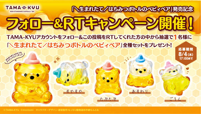 TAMA-KYU(たまきゅう)公式Twitterにて「\生まれたて/はちみつボトルのベビィベア」全種セットが当たるキャンペーンを実施中です。