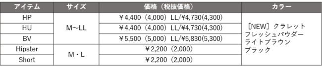 [HP][HU][BV]は、胸元の開きや華奢なストラップがスタイリッシュなデザイン。アジャスター付きで長さ調節が可能です。[HP]と[HU]はホック部分に伸縮性のある素材を使用しているので、アンダー部分がより快適にフィットします。ショーツは、脚口とウエスト部分がヘム仕様なのでアウターにひびきにくい。お好みの丈感で選べる2型をご用意しています。