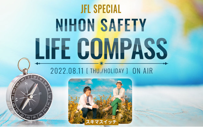 札幌FM NORTH WAVE、東京J-WAVE、名古屋ZIP-FM、大阪FM802、福岡CROSS FM、全国5地区のFMラジオ局で構成するJFL(Japan FM League)では、山の日である8月11日(木・祝)、スキマスイッチがナビゲーターを務める特別番組『JFL SPECIAL NIHON SAFETY LIFE COMPASS』(J-WAVE 18:00~19:55)をオンエアいたします。