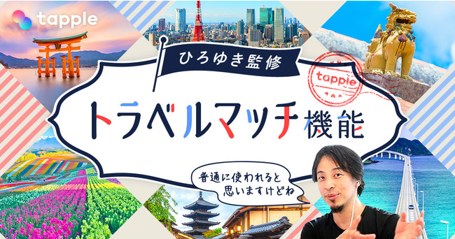 株式会社タップル(本社:東京都渋谷区、代表取締役社長:飯塚勇太)は、運営するマッチングアプリ「タップル」において、8月22日(月)より、ひろゆき氏監修の”旅”をきっかけに現地の人とマッチングできる新機能「トラベルマッチ機能」の提供を開始いたします。