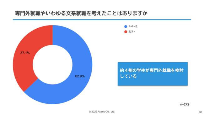 「専門外就職やいわゆる文系就職を考えたことはありますか?」と質問したところ、「いいえ」と回答した学生が62.9%となりました。「はい」と回答した学生は37.1%で、約4割の学生は専門外就職を検討しています。