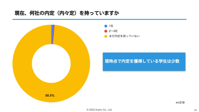 「現在、何社の内定(内々定)を持っていますか」と質問したところ、「1社」と回答した学生は0.9%、「2~3社」は0.5%でした。2022年6月現在、98.6%の学生がまだ内定を獲得しておらず、24卒の就職活動はまだ始まったばかりのようです。
