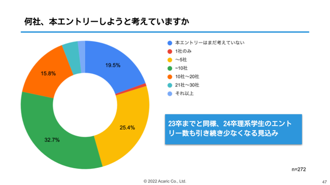 「何社、本エントリーしようと考えていますか」と質問したところ、「10社以内」と回答した学生が37.2%、「5社以内」が25.4%、「10~20社」が15.8%となりました。23卒までの学生の傾向と同様、24卒理系学生のエントリー数も引き続き少なくなる見込みです。