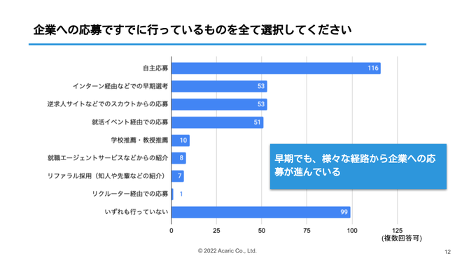 「企業への応募ですでに行っているものを全て選択してください(複数回答可)」と質問したところ、「自主応募」の回答が最多で116、続いて「インターン経由などでの早期選考」「逆求人サイトなどでのスカウトからの応募」がともに53、「就活イベント経由での応募」が51となりました。一方で「いずれも行っていない」は99となりました。就職活動早期においても、様々な経路から企業への応募が行われています。