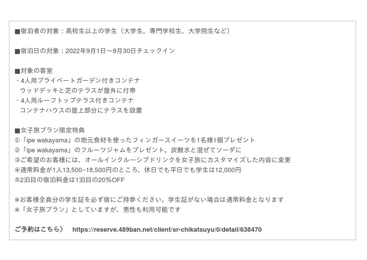 株式会社日本ユニスト(大阪市西区、代表取締役・今村亙忠)は、和歌山県の世界遺産・熊野古道のコンテナホテル「SEN.RETREAT CHIKATSUYU」(田辺市中辺路町近露)で、「学生限定 夏休み延長女子旅プラン」の販売を8月24日より開始します。通常料金より最大35%割引となるほか、「ipe wakayama」の地元食材を使ったフィンガースイーツなどの特典が含まれるプランとなっています。