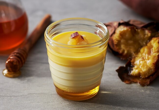 蜜芋と呼ばれるほど糖度が高く、しっとりとした食感の「紅はるか」。はちみつの優しい甘みが引き立つミルクプリンに、鹿児島県産紅はるかを使用した濃厚なスイートポテトを重ねました。濃厚なさつまいもと、はちみつの優しい味わいのコントラストが際立つ、秋の味覚を楽しむプリンです。