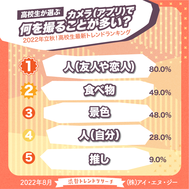 また、5位には「推し」がランクインしており、アイドルやアニメのキャラクターなど、自分の興味関心があることや、ものを撮影する“推し文化”が根強く浸透していることが見て取れます。
