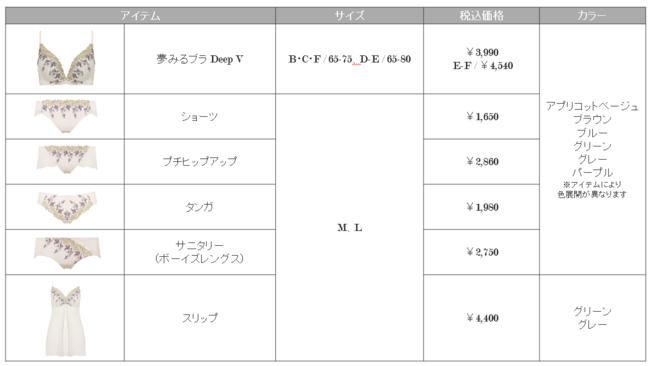 ブラジャーはくっきり谷間の「夢みるブラ Deep V」がエントリー。 人気ショーツ「プチヒップアップ」とのコーディネートでスタイルアップ!