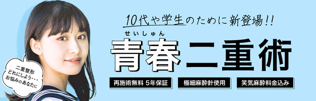 青春二重術はシンプルで低価格な2点留め埋没法に、笑気麻酔と痛みの少ない極細麻酔針オプションがセットになった美容整形初心者でも安心のティーン世代向け二重整形です。