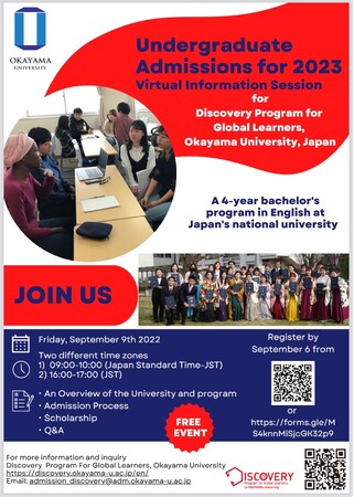 国立大学法人岡山大学(本部:岡山市北区津島中、学長:槇野博史)は、2022年9月9日、グローバル・ディスカバリー・プログラム(GDP)の国際入試説明会をオンラインで開催しました。主に、海外から高校生や保護者など合計で約35人が参加しました。