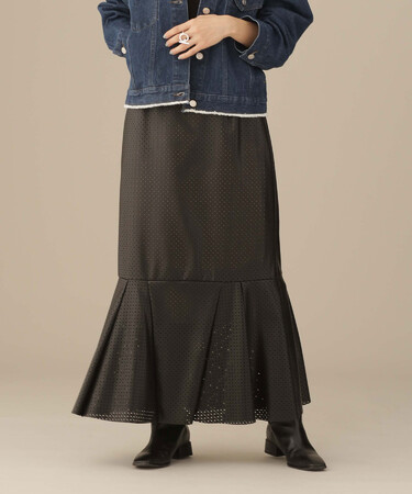切り替えヘムのマーメイドシルエットが女性らしいスカート。シーズンムードが高まるフェイクレザーに、細かなアイレットを効かせたこなれ感ある素材が印象的。裏地はアイレットがきれいに見えるようベージュを使用し、配色にデザイン。長めの着丈が大人な印象で、ON/OFFで着回せる万能なひと品。