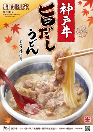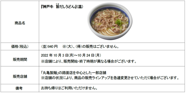 株式会社丸亀製麺(本社:東京都渋谷区、代表取締役社長:山口 寛)が展開する讃岐うどん専門店「丸亀製麺」は、期間限定・数量限定で『神戸牛 旨だしうどん』を2022年10月3日(月)から丸亀製麺の路面店を中心に一部店舗にて販売いたします。「うどんで日本を元気にプロジェクト」のもと、「うどんでみんなを笑顔にしたい」という丸亀製麺の想いと、「おいしい食材を全国に届け、その魅力を知ってもらいたい」という生産者の想いが重なり、毎回大好評の神戸牛と打ち立てのうどんが掛け合わさった特別な一杯をご用意いたしました。