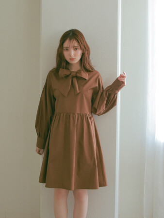 フレアシルエット、大きめのリボン、袖口がキュッと絞まったボリューム袖。