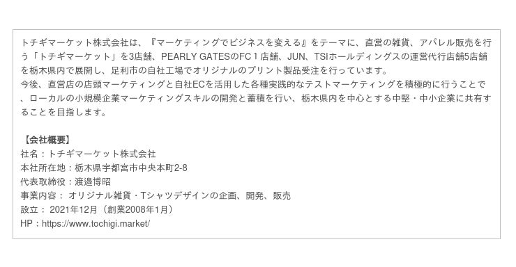 今後もトチギマーケット株式会社は、今回の寄付型にこだわることなく、地元アーティストや企業とのコラボなどを含めて地域貢献型プロジェクトを積極的に進めていく予定です。