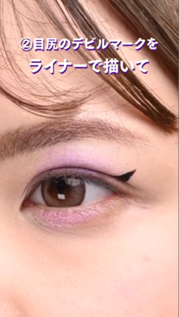 今回はパープルカラーで統一感を出し、目尻にはアイライナーでデビルマークを。