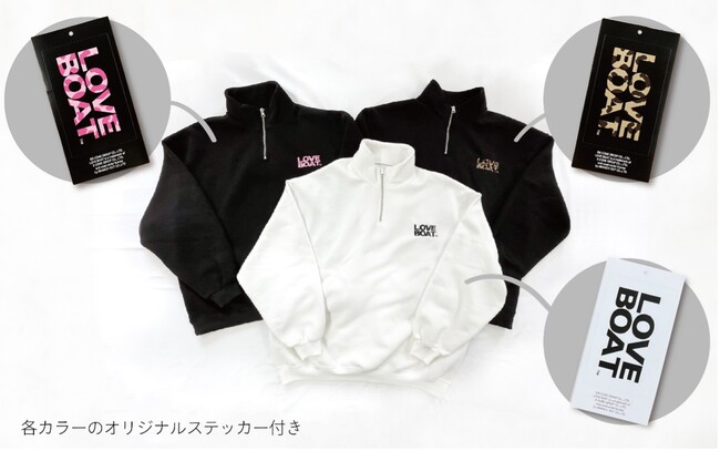 胸元にワンポイントで「LOVE BOAT」のロゴが施されたアイテム。ハーフジップとオーバーサイズなシルエットが特徴で、トレンド感満載です。服のロゴと同じデザインのステッカー付き。