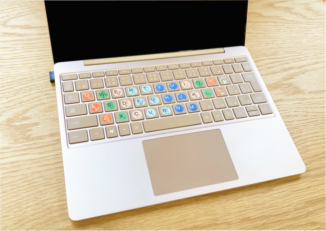 母音については、一⻫指導で一時間かけて行いますが、そのあとは子音との組み合わせであるということを教えます。あとは、個人差があるため、自力で学習する方法が必要です。どの指がどの子音のキーを押さえるかということを「自分で」確かめながら操作するためには、子音を示したシールが必要だと思うようになり、このシールのアイディアを思いつきました。