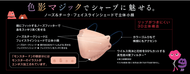 マスクにデザインされた、ノーズ&チークシェードとフェイスラインシェードの色影マジックで立体的な小顔印象を演出。リップがつきにくい3D立体構造のマスクで、リップメイクを思い切り楽しめます。