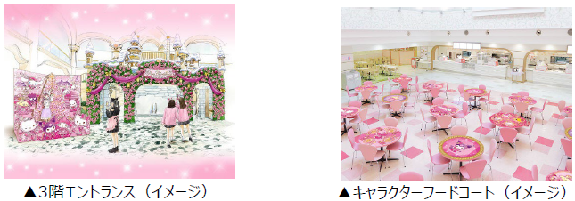 3階エントランスには、ピンククリスマスをイメージした色鮮やかなフォトスポットが登場。入り口からクリスマス気分を盛り上げます。キャラクターフードコートのテーブルにも、ドレスアップしたキャラクターたちが描かれ、ピューロランドの各所で、訪れたみなさまをおもてなしします。