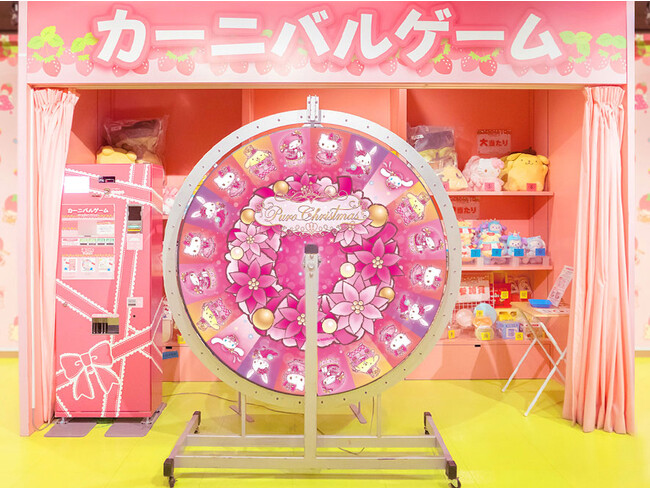 サンリオタウンで大好評開催中のカーニバルゲームでは、期間限定でルーレットがクリスマスデザインとなって登場。ルーレットの中心には大きなピンク色のクリスマスリースが描かれ、周りにもイベント限定コスチュームを着たキャラクターたちが描かれています。