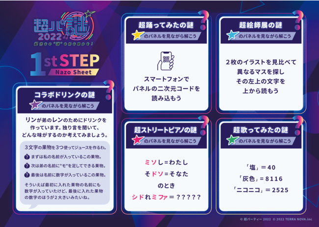 株式会社TERRA NOVA(本社:東京都千代田区、代表取締役社長:小川幸也)は、株式会社ドワンゴ(本社:東京都中央区、代表取締役社長:夏野剛)が主催する「超パーティー2022」内で実施される謎解きイベント「超パ謎」を企画・制作いたしましたことをお知らせいたします。