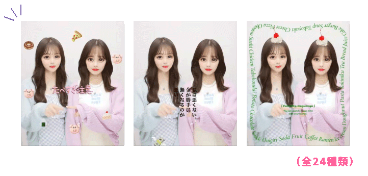撮影中の楽しさをそのまま切り取ったような仲良し感溢れる動画が撮影できる「ニコイチムービー」を搭載。本機能では、プリ撮影時の「ポーズ診断」の結果に合わせたフィルターが全24種類の中からランダムで4種類登場し、その中からお好みの1つを選択可能。フィルターは、カフェめぐりやご飯の日におすすめな食べ物のスタンプや、放課後やショッピングにぴったりな「アフタースクール」「おかいもの」といった文字スタンプが自動で反映されるデザインなどをご用意しました。また、撮影時には簡単な動画用ポーズ見本もランダムで登場し、真似して撮影するだけで仲の良さが伝わる動画に仕上がります。