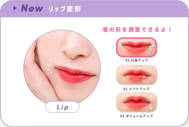 『apimy』では、レタッチ&メイク機能を豊富にご用意。従来機でも人気の高い「カラーまつげ」や片目ずつそれぞれの大きさを調節可能な「目の大きさ」機能など全10種類を取り揃え、細かい部分まで好みの“盛れ感”にこだわれます。この他にも、口角アップ・リフトアップ・ボリュームアップの3種類からなりたい口の印象を選べる「リップ変形」も新搭載します。
