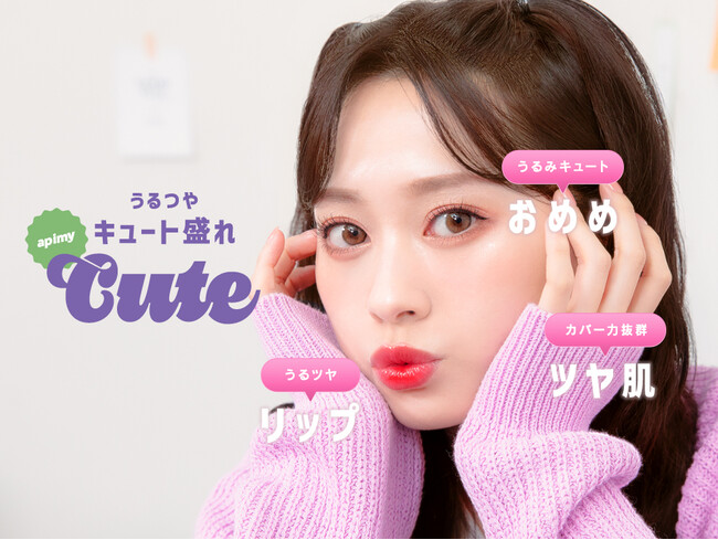 さらに、『apimy』は“とびきりキュートな盛れ感”を感じられる写りが特徴。大きなキャッチライトと束感のあるまつげで存在感のある可愛らしい目を演出。カバー力抜群のツヤ肌と血色感のある赤みのリップで、華やかな印象に仕上がります。