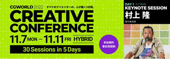 株式会社ボーンデジタル(本社:東京都千代田区、CEO:新和也、URL:https://www.borndigital.co.jp/)は11月7日からの5日間に渡り国内最大級のCGイベント「CGWORLD 2022 クリエイティブ カンファレンス(https://cgworld.jp/special/cgwcc2022/)」を開催することを発表しました。ゲストに現代美術家 村上隆氏をはじめ、多数のクリエイターたちによる事例など全30セッションを予定。最終日はハイブリッド開催を行います。詳しくはイベントページをご覧ください。※参加費無料