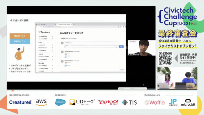 一般社団法人コード・フォー・ジャパン(Code for Japan、代表:関治之)は、22歳以下を対象とした学生向け開発コンテスト「Civictech Challenge Cup U-22」(以下、CCC U-22)を開催しました。勉強会、ハンズオン、メンタリングを実施しており、9月17日(土)の最終審査会では、一次審査を通過した8つの学生開発チームから制作した作品が発表されました。
