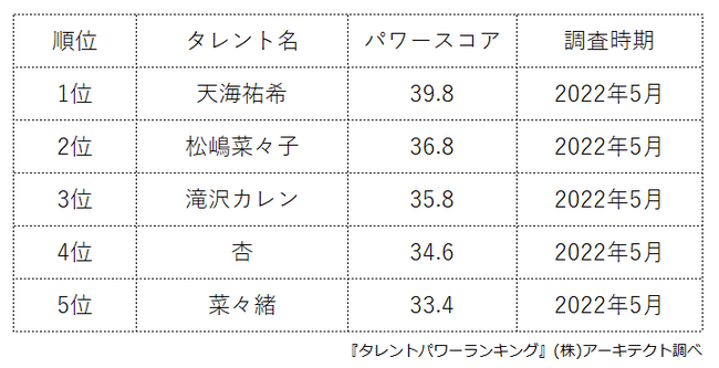 本ランキングは、2022年5月度に実施したタレント調査データ(一部過去実施データ)を利用し、タイトルに応じてランキング形式でまとめたものです。