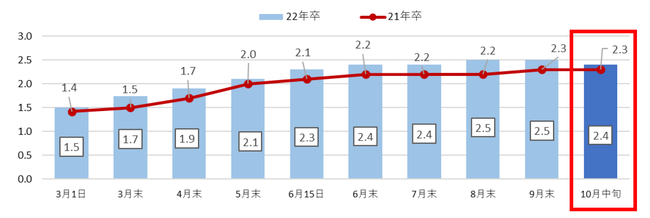 2023年卒業予定の大学生・大学院生の10月10日時点での内定率は前年比2.4pt増の89.6%、平均内定保有社数は前年比0.1社増の2.4社だった。23年卒の本調査は採用広報解禁後の3月1日調査から内定式実施後の10月中旬調査まで毎月実施しているが、企業の採用意欲の高まりを受けたことも影響し、すべての月で内定率・平均内定保有社数ともに前年比増で推移する結果となった。【図1、2】