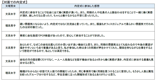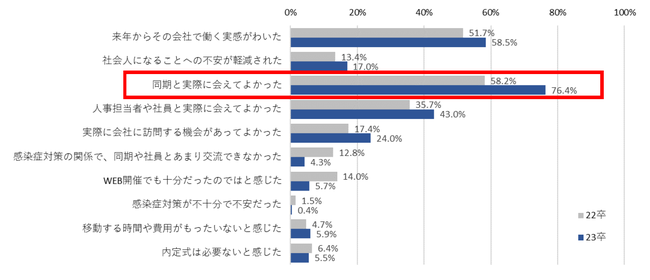 内定式に対面で参加した感想は「同期と実際に会えてよかった」が前年比18.2pt増の76.4%で大幅に増加。一方で「もっと同期や先輩との話し合いの場がほしい」などの声も【図5、6】