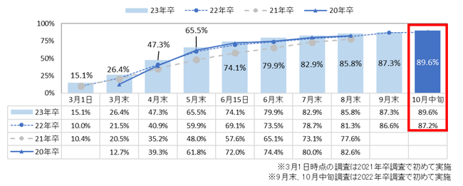 2023年卒業予定の大学生・大学院生の10月10日時点での内定率は前年比2.4pt増の89.6%【図1、2】