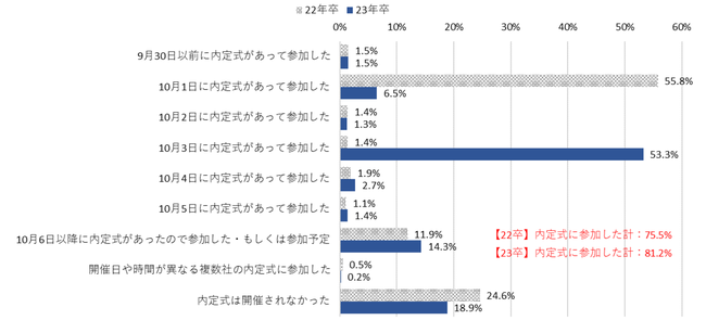 2023年卒業予定の大学生・大学院生の10月10日時点での内定率は前年比2.4pt増の89.6%。内定式に対面で参加し「同期と実際に会えてよかった」と回答した学生は76.4%で前年より大幅に増加