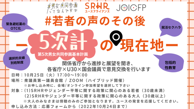 公益財団法人ジョイセフは、10月25日(火)、若者の団体・ネットワークである#男女共同参画ってなんですか、 SRHRユースアライアンスと共に、「#若者の声のその後 ー5次計の現在地ー 関係省庁×U30×国会議員の意見交換会」を対面とオンラインでのハイブリット形式で開催します。