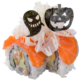 サーモン、アボカド、きゅうり、たまごの巻き寿司の上に、丁寧に仕込んだサーモンとシャキシャキのオニオン、ハロウィン限定デザインの海苔をトッピングしました。