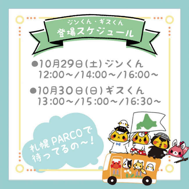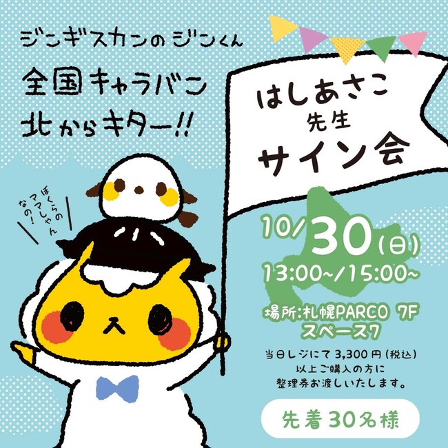 展覧会の開催を記念して、ジンギスカンのジンくん作者のはしあさこ先生サイン会とジンくんとギスくんが来場します。