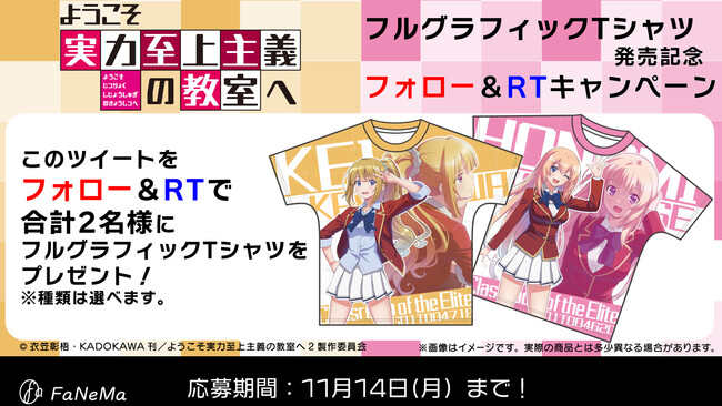 TVアニメ『ようこそ実力至上主義の教室へ』より「フルグラフィックTシャツ」の発売を記念して、Twitterフォロー&リツイートキャンペーンを実施いたします。