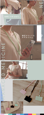 今トレンドのネックストラップ。スマホを手ぶらでもてる快適さから今年大ヒットした商品で、肩こりを気軽に治せたらと思ったところが商品化のはじまりです。
