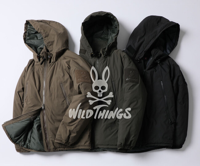 今回“サイコバニー”は、その無駄なく削ぎ落されたデザインが洗練された印象を与え、飽きずに着られること間違いなしのミリタリーギアの名作「ハッピージャケット」と、その程よい丸みのあるシルエットと必要最低限のアウトドア機能を加えることで、タウンユースで活躍する「パディングキャップ」を“ワイルドシングス”とのコラボアイテムにチョイスいたしました。