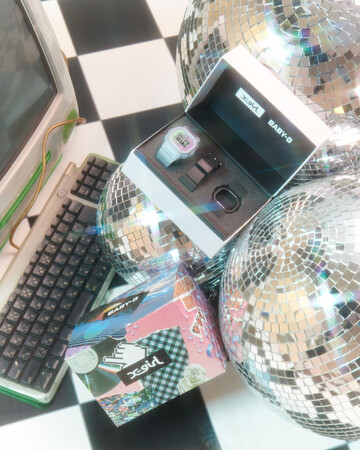 本コラボレーションは、2010年代初頭にインターネット上で生まれた「ヴェイパーウェイヴ」の世界観をテーマに採用。BABY-Gの定番モデル「BGD-565」をベースに、偏光デザインとネオンカラーを配色することで、ノスタルジックでバーチャルなムードを表現しました。裏蓋にはX-girlのロゴがデザインされています。さらに、バンドは裏面のレバーをスライドすると取り外しできるスライドレバー式を採用。交換用にブラックの樹脂バンドとベゼルを同梱し、シーンやコーディネートに合わせて付替えが可能です。パッケージも特別にデザインしたスペシャル仕様です。
