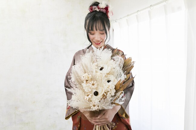 また、Calon DRY FLOWERでは「アニバーサリーブーケ~Anniversary bouquet~」をご提案させていただいております。アニバーサリーブーケとは成人式や特別な日に自分用に持つブーケのことで、終わった後はスワッグとして楽しめる「Calon DRY FLOWER」ならではのブーケでございます。