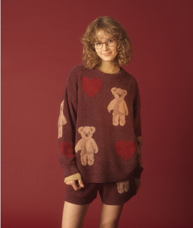 ホリデーベアと真っ赤なハートをジャガード編みした、総柄ニット。