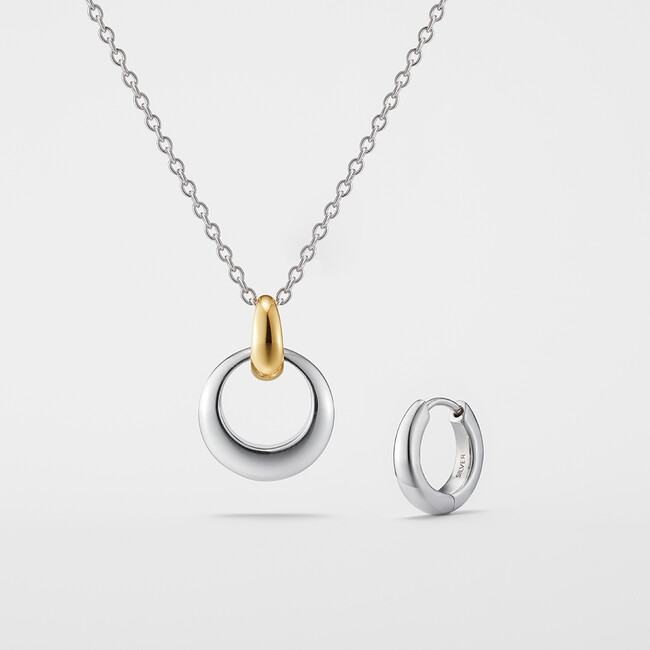 ネックレスと片耳ピアスのセットは、ネックレスのトップを外してピアスに通してもお楽しみいただける2way仕様。ミニマルながらも地金の曲線美が上品なデザインが特徴です。ニットやマフラーなどで顔周りにボリュームが増える冬の季節こそ、ジュエリーのアクセントによって印象をアレンジして。