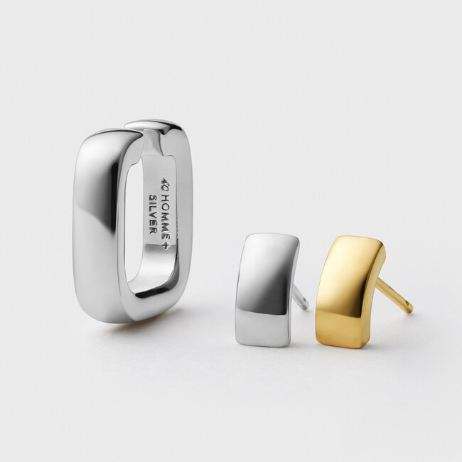 イヤーカフに、カラー違いのピアスを加えたセットも登場。その日の気分やコーディネートに合わせて自分らしさを表現できるセットジュエリーです。凛としたスクエアのフォルムに少しの丸みをもたせ、ジェンダーレスに身に着けやすいデザインに仕上げました。